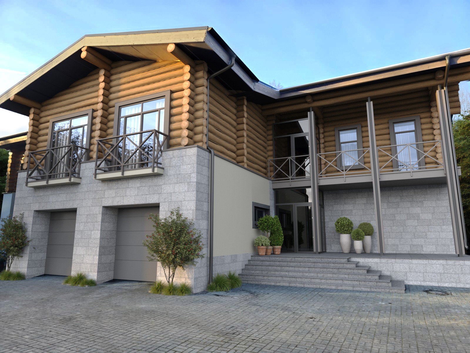 Комбинированная технология позволяет вести строительство параллельно с рубкой второго этажа, избежать больших усадок стеновых конструкций ( усадке подвергается один этаж), защищает древесину от влаги, разделяет дом на жилой этаж и общественную зону, экономит бюджет строительства, делает сложную запоминающуюся архитектуру дома, сохраняет экологичность проживания ( отдых хозяев происходит в деревянной части дома)
